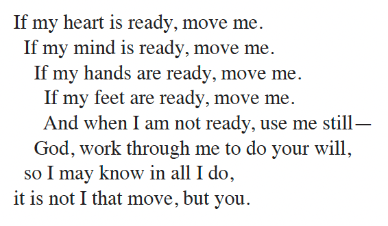 If My Heart is Ready is a great example of this. While it is a prayer of surrender and humility, the syntax of the stanzas create a sense of urgency and agency, as though our surrender to the will of God is not passive but active. The compounding repetition of phrases and the unconventional spatial formatting of the text combine to create the sense of motion conjured by the phrase “move me”. This is another thing I like about Adam’s text: while he does not often compose tunes, it is obvious that he is always mindful of how his words will “sing”.
