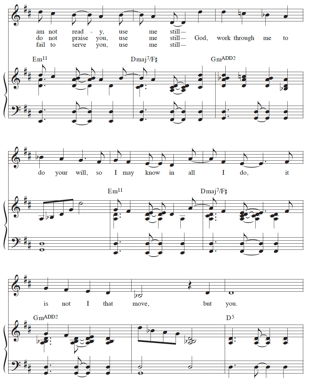 Melodic parallelisms mirror the repetition in the text with only the bass changing. This creates a wonderful sense of anticipation that leads to the climactic phrase “God, work through me to do your will”. Yet, here is the brilliance: Kate accentuates this phrase not by arriving on a stable or resolving chord, but to the highly unstable minor IV (a borrowed chord from the parallel minor key of D minor). The surprise of this chord shines a bright spotlight on these words and the concluding phrase “it is not I that move, but you.”